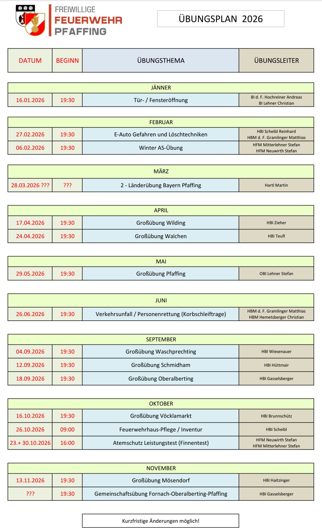 | Datum | Beginn | Übung / Ausbildung | Leitung |