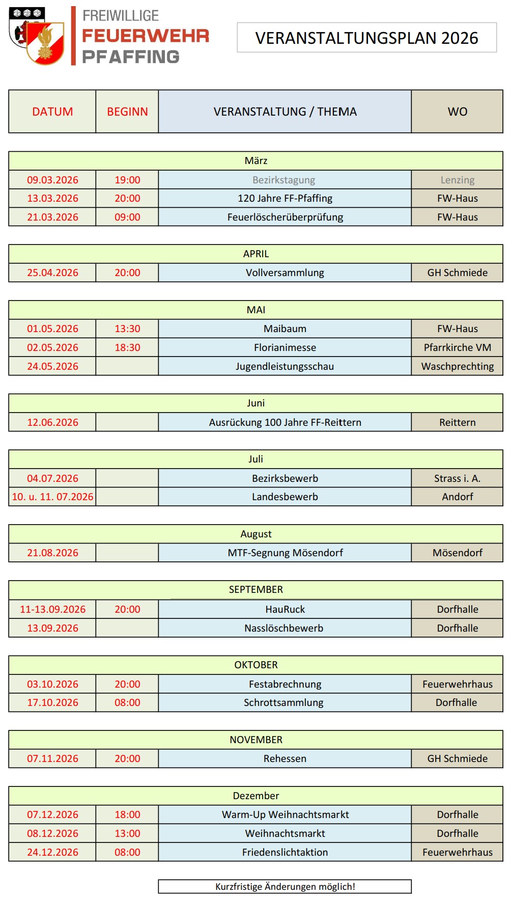 | 13.03.2026 | 20:00 | 120-Jahr-Feier FF-Pfaffing | FW-Haus |